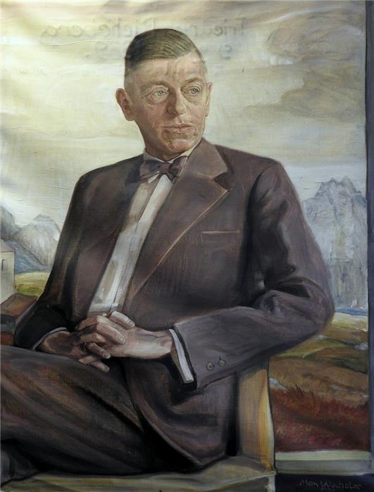 Portrait von Herrn Friedrich Riekeberg vor dem Fenster, im Hintergrund eine Berglandschaft