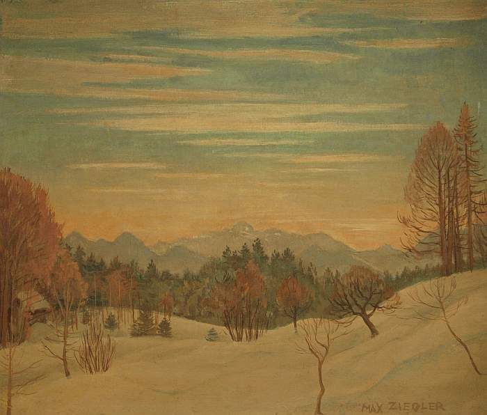 Blick auf voralpenländische Winterlandschaft im Abendlicht.