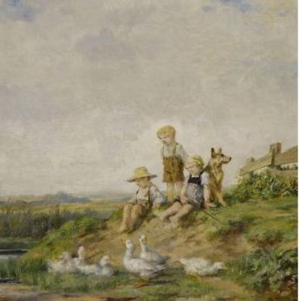 Kinder mit Hund und Enten am Bachufer
