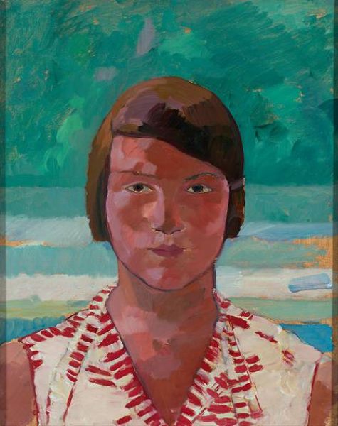 En-face-Porträtbüste eines Mädchens mit braunem Pagenkopf