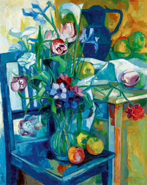 Still life with flowers and fruits on a blue chair