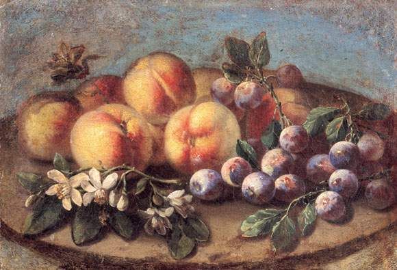 Nature morte aux pêches et prunes dans un plat