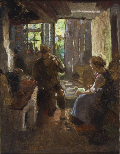 Blick in eine Rauchküche mit Jäger und Sennerin.
