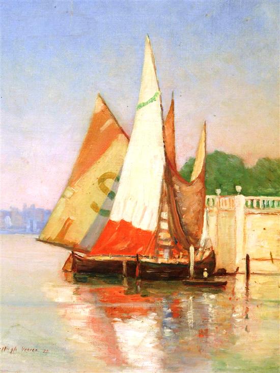 | depicts cluster of sailboats in water with man on row boat at right | |