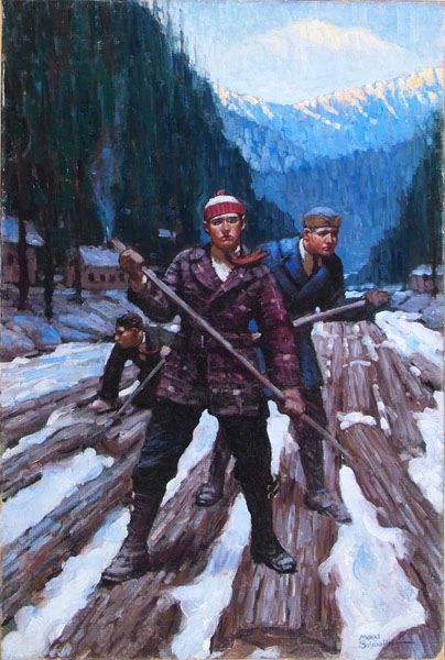Boys riding logs in river.
