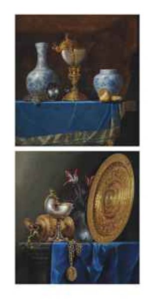 | A nautilus cup, 17th Century Chinese porcelain vases, grapes, a pewter chalice and a partly peeled lemon on a draped table; and | |