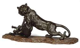 A JAPANESE BRONZE TIGER AND WOLF GROUP