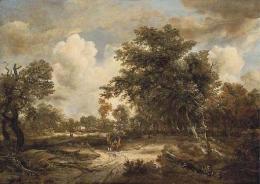 A wooded landscape with peasants on a path