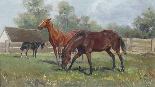 Black, bay and light bay horses in a paddock