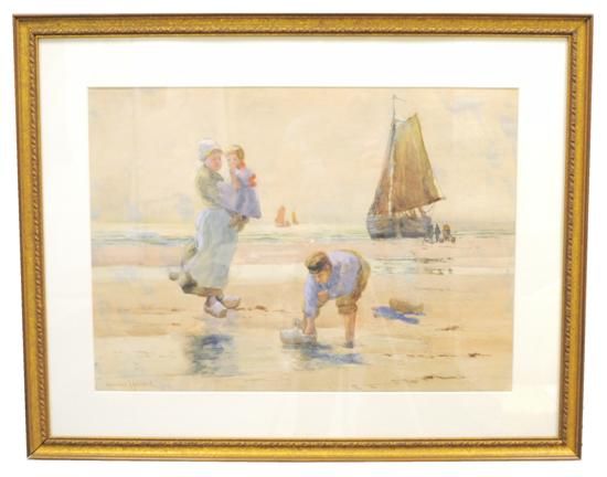 | Continental shore scene, mother and child in wooden clogs looking at father digging in sand, sailing vessels in background | |