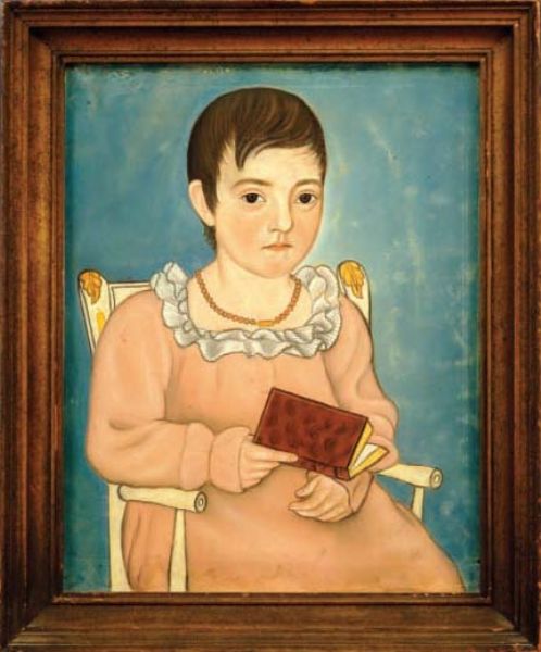 | PORTRAIT OF GIRL IN PINK HOLDING A BOOK AND SEATED IN WHITE RODBACK ARMCHAIR WITH YELLOW LEAFTIPS | |