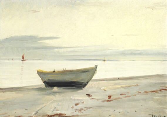 | Coastal view from Skagen with calm sea and a boat on the beach | |