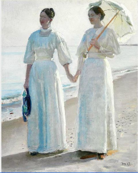 Minne and Sophie Holst in light summer dresses on Skagen beach