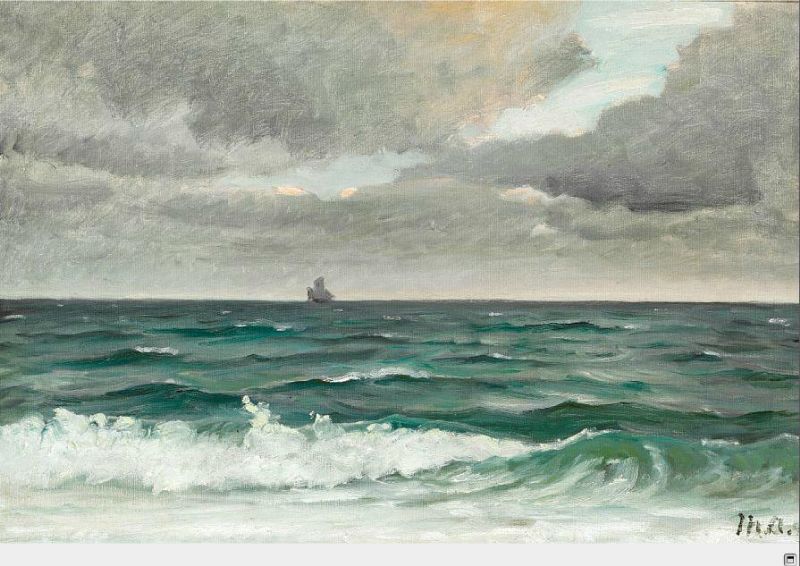 | View of the sea with a sailing ship on the horizon, the sun breaks through the clouds | |