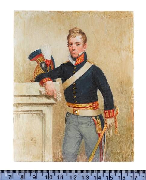 | An Officer of Royal Horse Guards, wearing blue coat, with red and gold collar, cuffs and sash, a sword in his left hand, he rest | |