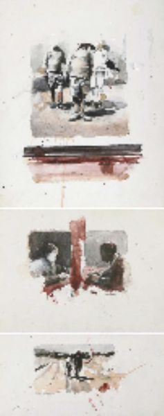| Watercolor pencil and coffee on paper laid down on cardboard, three works | |