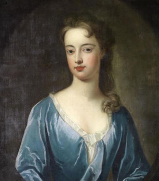 Portrait of a lady, half-length, in a blue dress and white chemise, within a painted oval