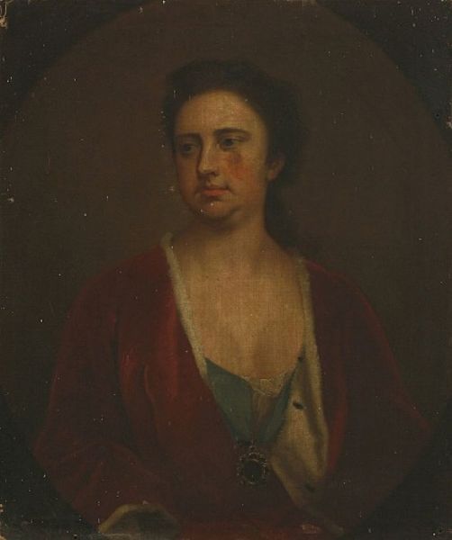 | PORTRAIT OF A LADY, HALF LENGTH, WEARING A RED ERMINE-LINED CLOAK AND A JEWEL SUSPENDED FROM A BLUE RIBBON | |