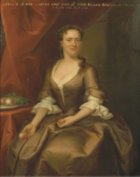 | Portrait of Lydia Harvey, three-quarter-length, in a brown dress with a white chemise, seated at a draped table with a plate of | |