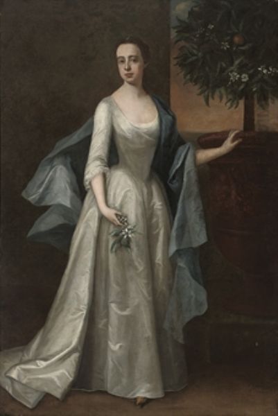 | Portrait of a lady, full-length, in an oyster satin dress and blue wrap, a sprig of orange blossom in her right hand, in an inte | |