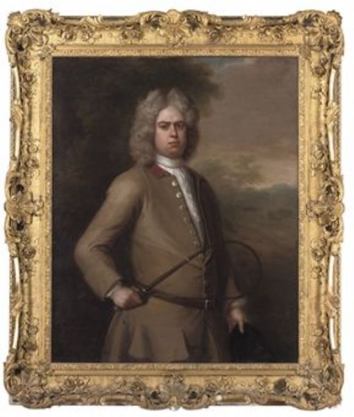 | Portrait of John Sutton, three-quarter-length, in a buff coat, holding a riding crop and hat, a country house beyond | |