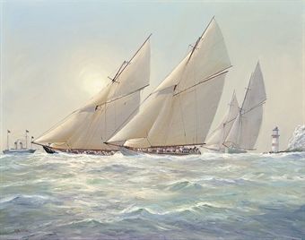 The sun burning through the mist as Britannia leads the pack off the Needles
