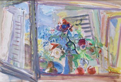 FLEURS ET FRUITS DEVANT LA FENÊTRE