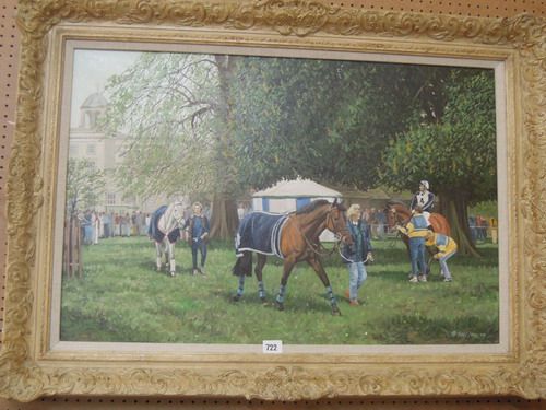| a scene at Badminton Horse Trials with female characters leading horses through onlookers and with the house to the distance | |