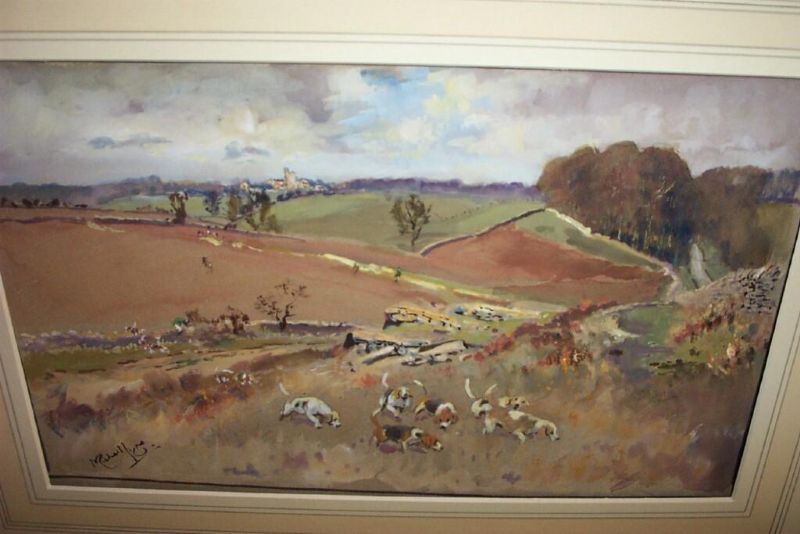 | a hunting scene with hounds running in open country | |