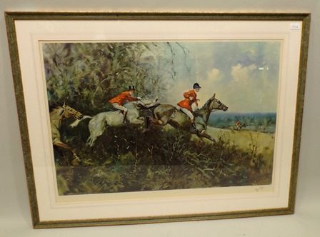 Members of The Hunt in full cry jumping scrub