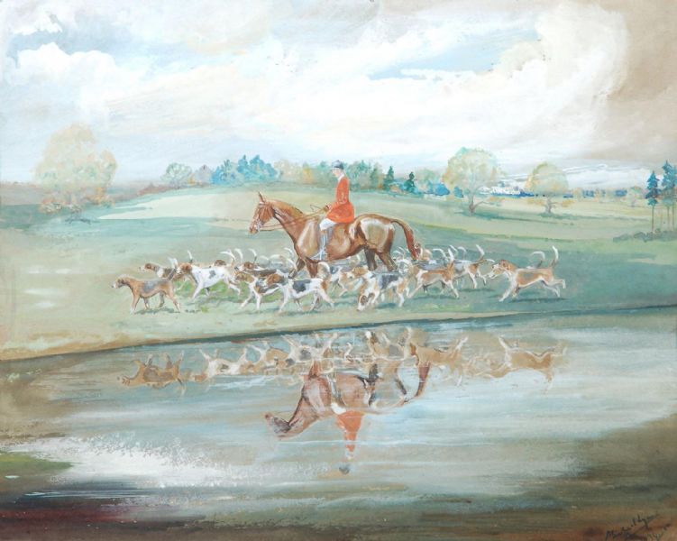 Huntsmen and hounds passing a lake