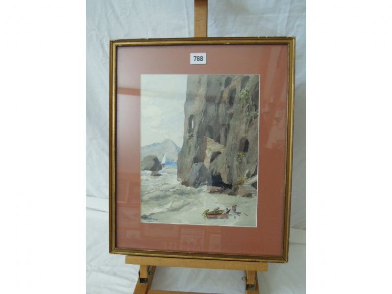 | coastal scene with fishermen pulling a boat ashore beneath a towering rocky precipice pierced with arches | |