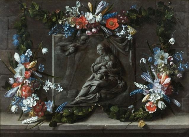 | Bas-relief avec la Vierge à l'Enfant entouré d'une guirlande de fleurs | |