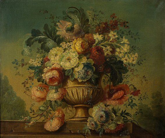 | BOUQUET DE FLEURS DANS UN VASE SCULPTÉ SUR UN ENTABLEMENT | |