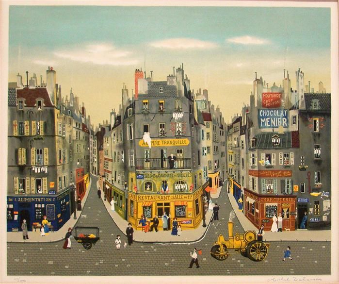 Belebte Pariser Straßenszene mit Dampfwalze
