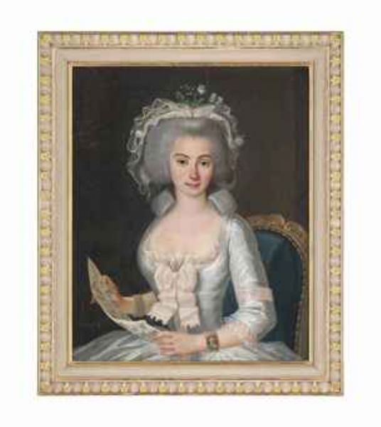 | Portrait of a lady, half-length, seated in a white dress with a ribbon, holding a musical score | |