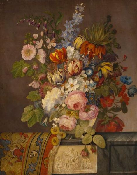 | Bouquet de fleurs sur un entablement sculpté avec un tapis | |