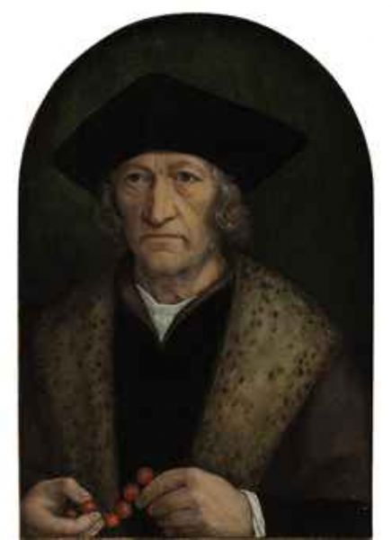 | Portrait of a gentleman, half-length, in a black hat and brown robe with a lynx collar, holding a rosary | |