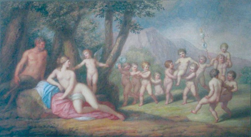 | Classical scene of Venus, Cupid and attendant faun with playful musical putti | |