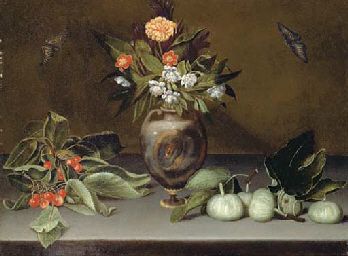 | Narcissi and a carnation in an urn on a stone ledge with cherries, figs and butterflies | |