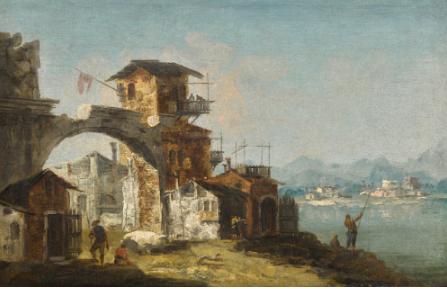 | AN ARCHITECTURAL CAPRICCIO WITH FIGURES BESIDE A RIVER | |