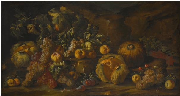 | A PAIR OF STILL LIFES WITH FRUIT STREWN ON A FOREST FLOOR | |