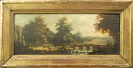 | A WOODED RIVER LANDSCAPE WITH FIGURES CROSSING A BRIDGE, A HERDSMAN BY CLASSICAL RUINS TO THE LEFT | |