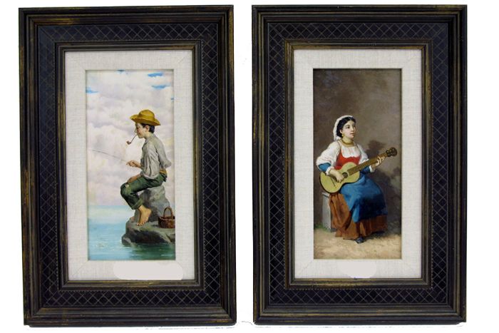| Barefoot boy sitting on rock fishing with pipe in his mouth; and Young woman seated playing guitar | |