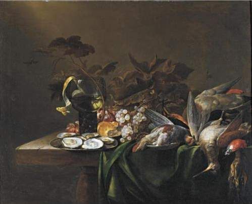 | STILL LIFE WITH GAME BIRDS, A PLATE OF OYSTERS, AND GRAPES ALL RESTING ON A DRAPED TABLE | |