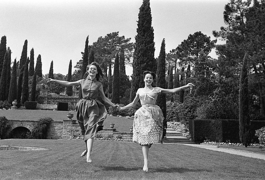 | 6e Festival de Cannes. Pieds nus et main dans la main, Brigitte Bardot et Leslie Caron esquissent un pas de deux dans les jardin | |