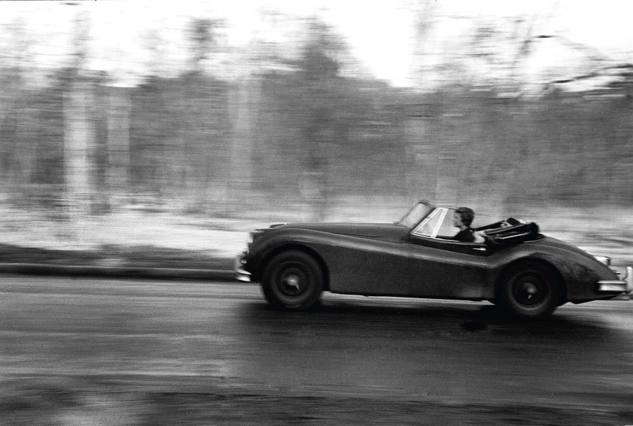 | Sur une route de campagne, Françoise Sagan à toute allure dans sa Jaguar. 22 juin 1956. | |
