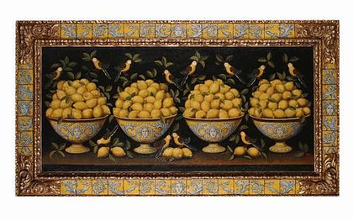 Still life of birds and bowls filled with lemons