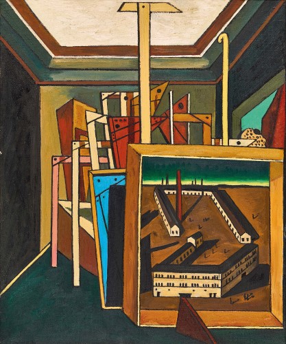 "Not de Chirico (Metaphysical Interior with Workshop, 1948)".