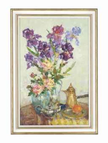 | Iris and roses in a blue jug, together with a gold coffee pot and a silver teapot | |